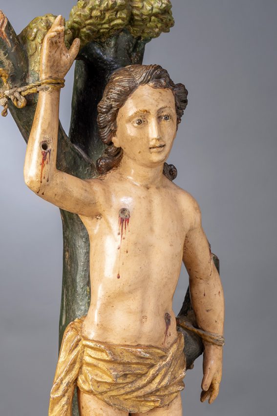 Very fine polychromed carving in wood; Sebastian. Spain, mid to late 16th century. Height: c.61 cm.